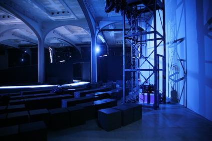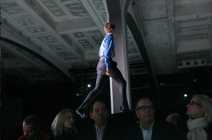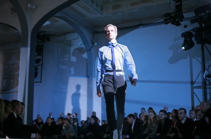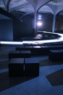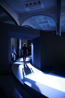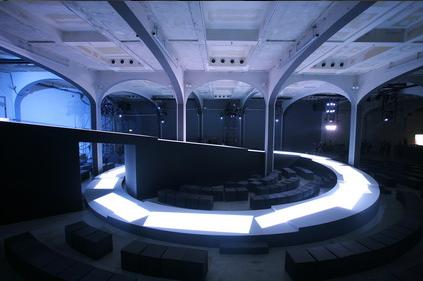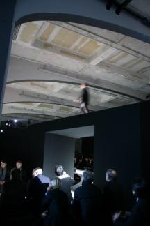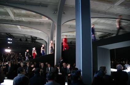 PRADA 2008秋冬男装发布会会场的主导几何元素依然是方形。不同的是,这次模特们不再走在道路交错的花丛中,而是走在雪域高山之上。秋冬发布会的会场采用蓝、白作为主色调,更能体现出男性的俊冷和硬朗。