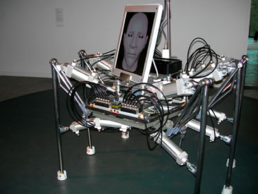 ARTIST斯蒂拉克 DATE2006-2008 COUNTRY澳大利亚 MEDIA机器人系统 这是一个直径为2米的自控交互式行走机器人。它有六条腿,垂直安装在其底盘上的液晶显示屏由计算机成像显示出人头像,象征“头脑”。头脑可以向各个方向转动,以配合所显示的头像动画。机器人带有超声波扫描传感器,可以感知是否有人从它前面经过。无人经过时,它会坐在原地不动。一旦有人进入展示空间,它就会站起来,从预排程序库中调出一些动作指令进行几分钟舞蹈表演,然后停下来直到再有人经过。机器人活动的舞台直径约为4-5米,其传感系统会探测它是否已接近舞台边缘,使它及时退回转向。这是一个真实-虚拟并存系统,其机械腿的动作是真实动作,其显示屏中面部表情的点头、转动、倾斜、眨眼等是虚拟动作。通过压缩空气的旋律和机械声音,行走的头也可以发声。该机器人还可以通过基于网络的三维模型来驱动,由运动图像菜单来控制其具体动作。整个机器人是以压缩气作用作为运转动力的。