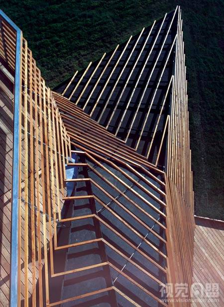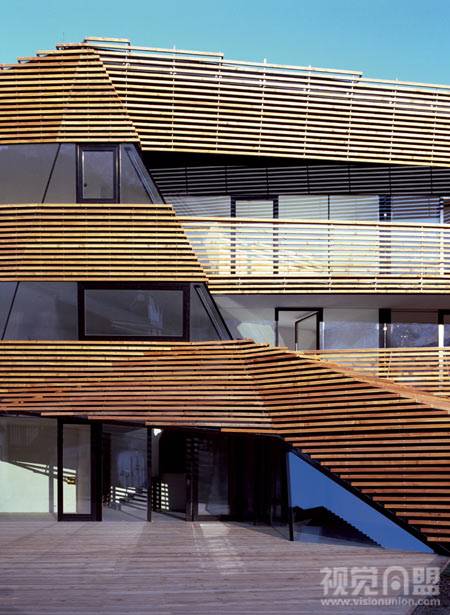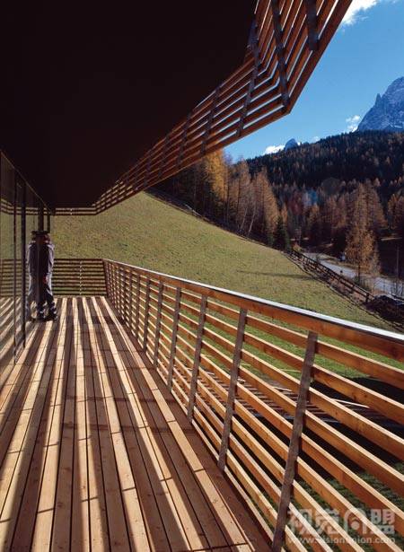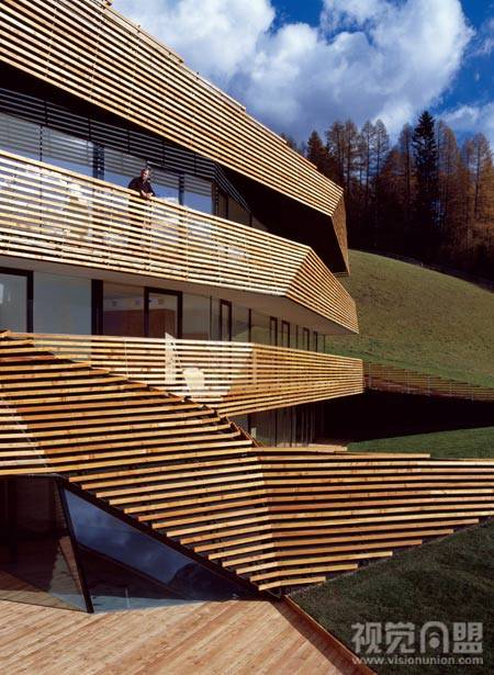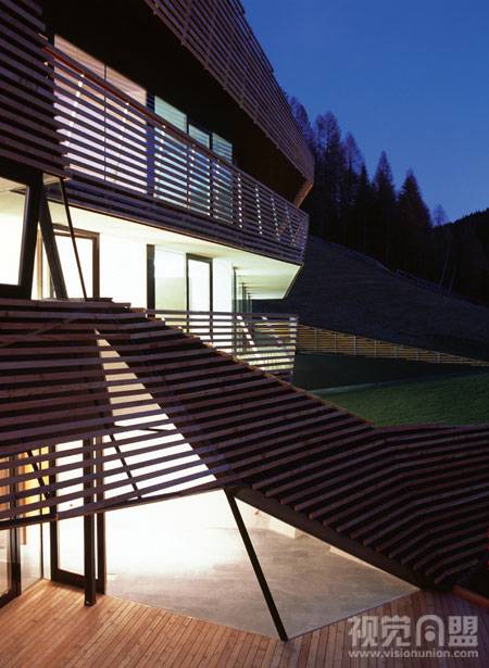 由Plasma Studio于去年11月完成的Strata酒店坐落于意大利白云石一陡峭的山坡上,其外观主要由木板材料和玻璃为主,横向的木板条不断重复应用构成了它独特的外观。阳光透过一条条木板的间隔中透到房间中形成了特别美丽的投影。由于木板条易于拼接,使得建筑物非常容易做出奇特的造型,这也让它显得尤为特别。