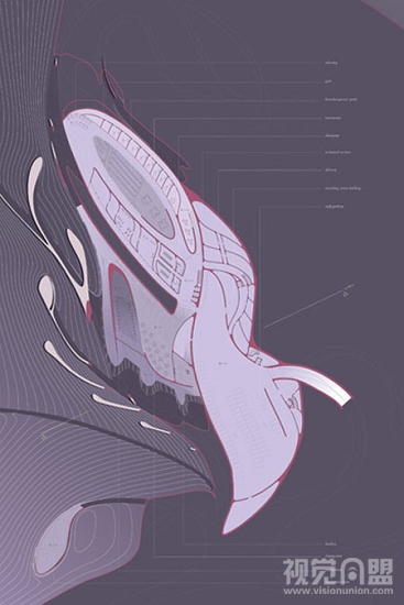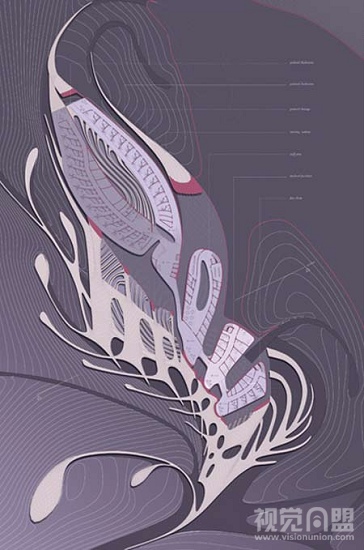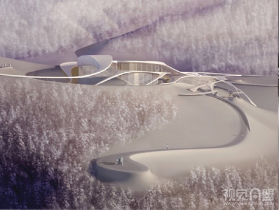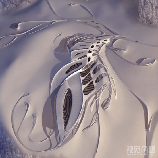 Asemic Scapes是奥地利的一个能容纳50人左右的康复中心。就其优美的建筑外形来看,相信大部分人会想到的现代的装饰主义。的确,这座建筑贴服的阿尔卑斯山上,在俯视图上看,它是一个巨大而漂亮的装饰图案,就像是艺术家们在阿尔卑斯山上雕刻出来的艺术精品