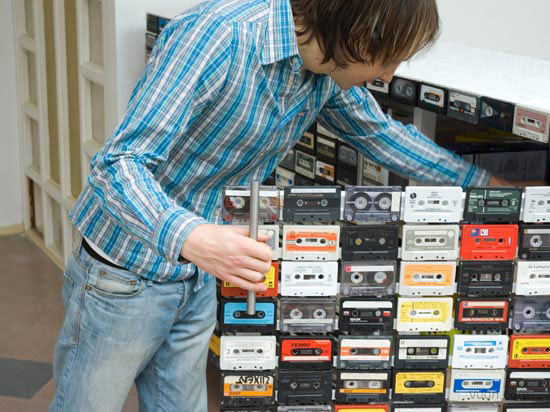 年轻的荷兰设计师Patrick Schuur最新设计了一款用盒式录音带装饰的橱柜,整个橱柜上的918个盒式录音带被固定在橱柜的支架上。