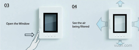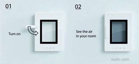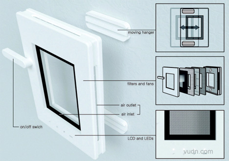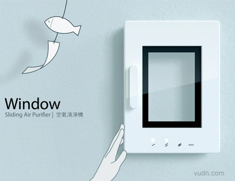 Jae-Han Song设计的名为Window的空气净化器造型同真实窗口类似。我们习惯打开窗户以流通室内的空气,而这个净化器仿制了窗口的功能。当中间透明的液晶显示屏呈黑色,则反映室内的空气质量正急剧下降,需要净化空气。
