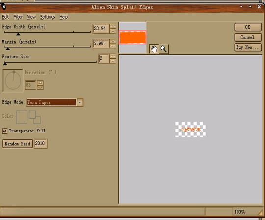 2.复制(CTRL+C)粘贴(CTRL+V)刚才的矩形选效果→Eye candy 4000滤镜→摇动效果。属性为(移动类型:Browniar动作。 泡沫尺寸:307.69 弯曲数量:334.32。扭曲:49) 设置完后继续点效果→斜角和浮雕→内斜角。属性为:(斜角边沿形状:平坦。宽度:3。透明度:75%。柔化9。角度:142。按钮预设:凹入)得到效果如图: