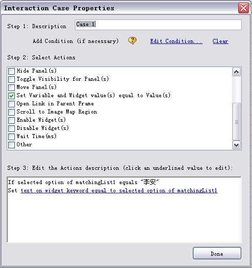 勾选Select Actions(选择动作)中的“Set Panel state(s) to State(s)(改变动态面板的状态)”,在“Step 3: Edit the Actions description(第三步:编辑动作描述)”中选中蓝色的Set Panel链接,将动态面板“matching”的默认状态“none”改为“matching1”,即前面设好的姓“李”的“查询建议”状态。