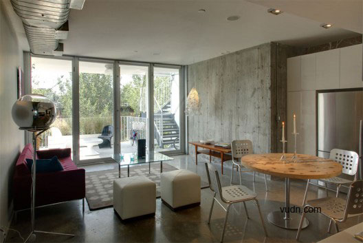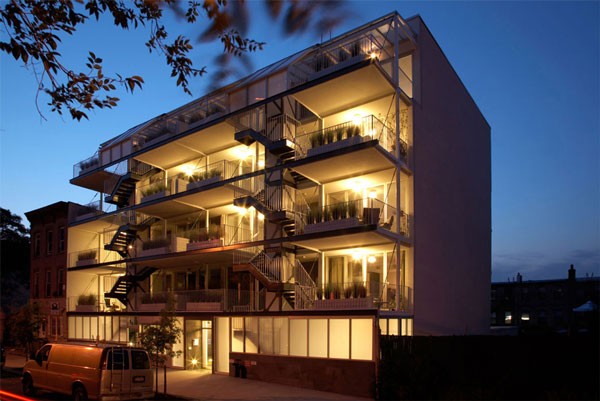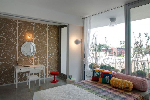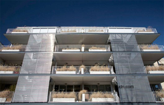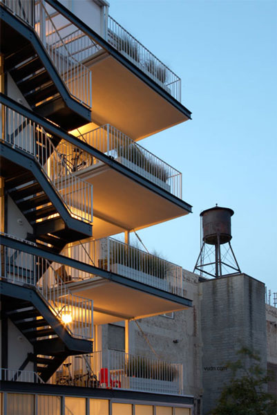 建筑师将所有的循环于建筑周边的诸如楼梯,电梯,走廊等都设计成了简单的直角矩形,穿过公寓的地板。正对南边的外部走廊也可以作为阳台使用。而该18座公寓几乎相似。他们每座占地800平方英尺,独立浴室,厨房,客厅和卧室。