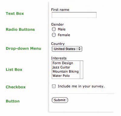 明确了表单所提问题及其表现方式,接下来需要提供给人们回答问题的方法。现在来讨论输入框:复选框、单选框、下拉菜单以及不同大小的文本框。