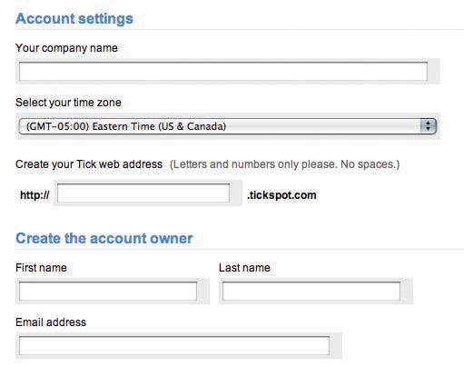 暗示提供组织答案的有用线索,人们填写时会自然考虑这些线索。如果输入框长度模糊不定,人们要思考为什么会这样。例如,图5.4,Tick网站表单,每个输入框长度几乎都不一样。人们会想:“是不是网址应当比公司名称短一些?”,或者“为什么email输入框这么长?是不是漏了些什么?”