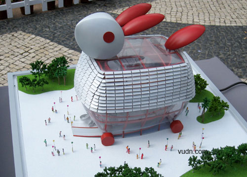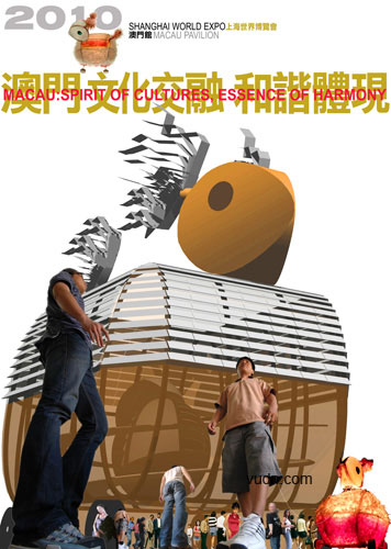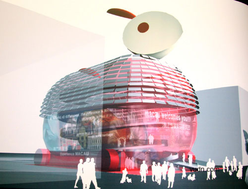 上海世博会澳门馆确定以“玉兔宫灯”方案作为外形设计蓝图。兔子是和谐相容的象征,机灵通达的化身,是古今中外人们乐于运用的吉祥动物,澳门馆的玉兔外型设计灵感来自于华南地区古时的兔子灯笼外型。如果将上海世博会中国馆比喻成神话中的南天门,那澳门馆就犹如在南天门旁的一只仙兔,与中国馆一起共同迎接世界各方的来宾。
