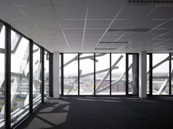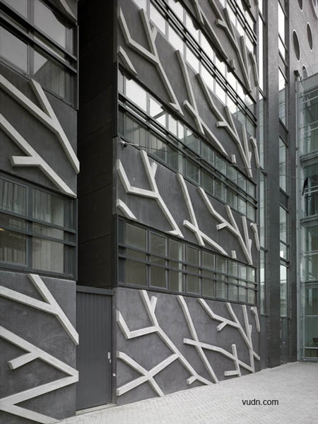 该办公楼从它所在的位置获得了一个颇具浪漫色彩的名字——银公园码头,它位于荷兰Lelystad的Zilverparkkade。由west8所设计的这一地区的规划,符合目前的城市中心高密度的趋势。由于地块狭窄,办公楼和一个17世纪的田园诗气质的荷兰运河房屋肩并肩并排。在这样紧凑行严格布局中,能辨别建筑身份的唯一因素是立面。所有四个门面的表面都全部或部分覆盖着预制混凝土构件,象征着一个分支状结构。巨型花丝是来自于对分形算法的研究。荷兰绘画艺术家Maurits Escher确立了模式。需要特殊技能去制定一个重复模式,用有限数量的的混凝土元素去构成无缝的花纹,同时,避免让人一眼看出花纹是重复的,这种要求与纺织品和墙纸的设计轮换模式相类似。