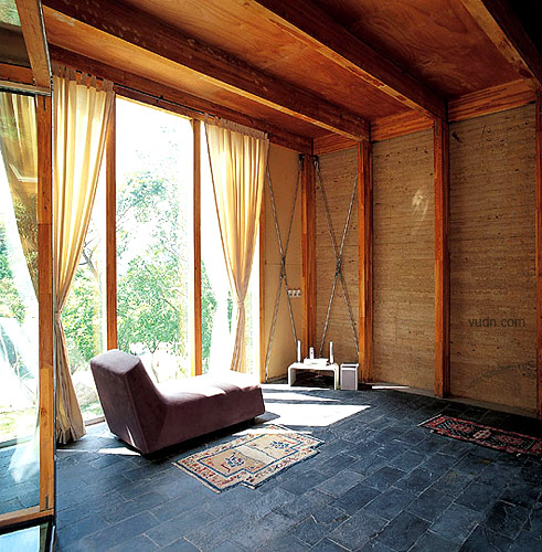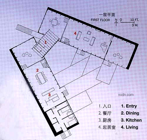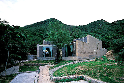 建筑从当中被分成两半,藉以引入了不同的景致、空间,也带入了"山水"意境。水的部分,有条小溪直直地登堂入室,在入口的玻璃地板之下粼粼闪光。中庭,则由一侧的山峦与另一侧住屋分裂的两翼共同围塑空间,柔和地处理了自然地京与人造建筑间的分际。