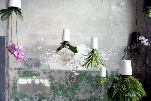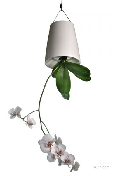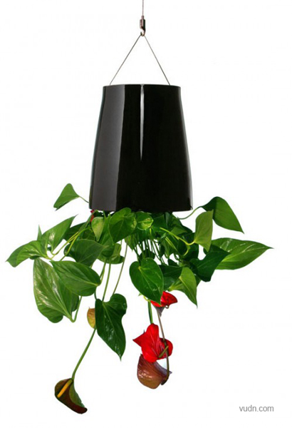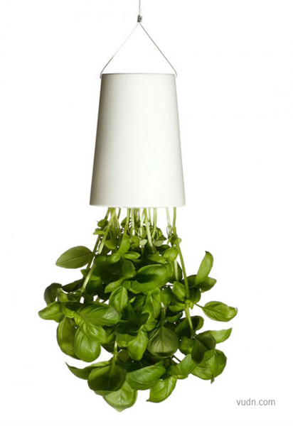 楼价的高涨,让很多爱好植物之人在狭窄的空间内挪不出地方来种植他们所喜爱的作物。而毕业于中央圣马丁的Patrick Morris设计的“sky planter”提供了一个解决方案,利用植物作为天花和墙壁的设计元素。一盆盆克服了万有引力的植物的确倒挂在空中生长。在特质陶瓷器皿顶部(植物的底部)安装了一个内置的蓄水系统,直接给植物根部供水。同时还可以让泥土不掉下来避免弄脏地板。