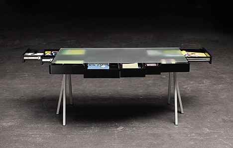 工作台上文件纸张和零东碎西的小物件越来越多,收纳整理成问题,看起来乱糟糟的不说,还总是想用哪个哪个就躲起来不见。捷克设计师lucie koldová设计了这个透明格子桌,桌面下有很多大小不一的格子,如果按照纸张规格来说,从A5到A2都可以放置,每个格子都是可以拉开的抽屉,桌面是磨砂的半透明材质,既可以看清楚物品或文件在哪个格子里,又朦朦朦胧看不太真切不至于显得太凌乱。