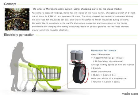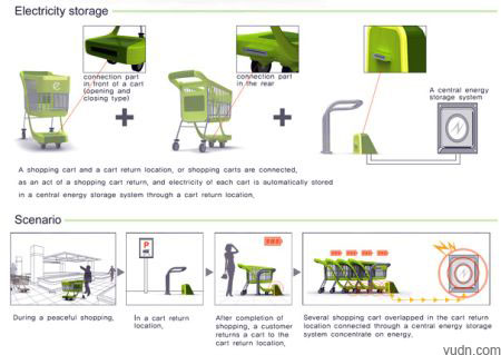 设计师通过给超市推车安装小部件,将推车移动过程中产生的动能转化为电能,并将其储存起来,然后再通过传输设备,在推车停靠回超市入口的时候将储存的能量转移到超市供电中心,为超市用电提供支持。