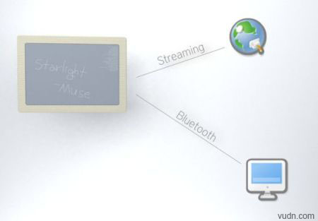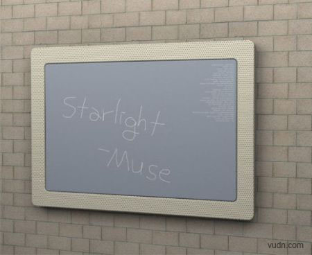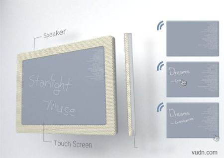 这款新型播放器模样像极了黑板,而“黑板边框”就是播放器的喇叭,“黑板”本身则是触摸显示屏。当播放歌曲的时候,歌曲信息就会在“黑板”右上角滚动出现。如果播放器已经连接了无线网络或是电脑,使用者则可以将自己在“黑板”上的即兴音乐涂鸦传送到网上,与大家分享。