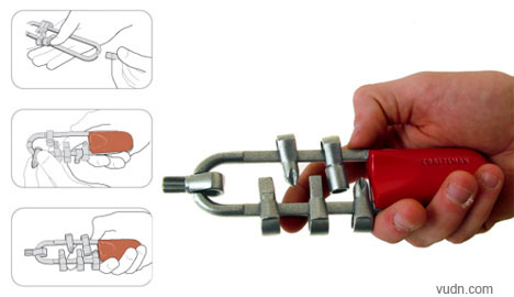 这款一体式螺丝刀与普通的很相似,只不过它的手柄顶端是一个长型的圆环,不同的螺丝刀头都固定在圆环的两侧,当需要更换刀头的时候只需要将所需的刀头滑到顶端即可。
