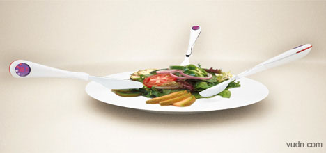 这套电子餐具在普通的刀、叉和勺子上整合了许多实用的功能。叉子上内置有成分分析器,只要将其插入食物,就可以实时地显示出食物中的脂肪、蛋白质和糖的含量;勺子可以用来称量食物的重量;而刀子则可以用来测量温度。用这样一组餐具吃饭,就可以更好的量化我们的饮食,以养成更为健康的饮食习惯。