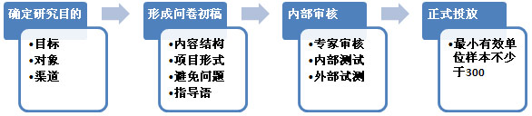 3. 渠道: 问卷投放的时候需要考虑样本的代表性、回收周期和数量。 一般投放周期为一周。可以采用定向投放(例如邮件投放)和非定向投放(例如线上系统)。定向投放回收率不应小于5%(完成问卷的人数/ 参与调查的总人数)。