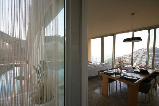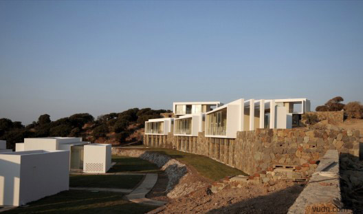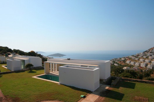 该建筑位于土耳其Bodrum半岛裸露的斜坡上,广阔,宽大,美丽的景致朝着地中海,沿地形线毫无保留的展开。建筑师构建了一个巨大的露天剧场形式的别墅,每个层面按照斜坡的曲线而设,形成一个连续的石层挡土墙。