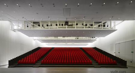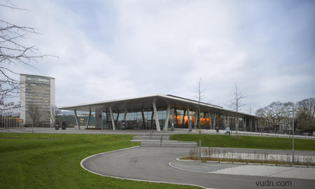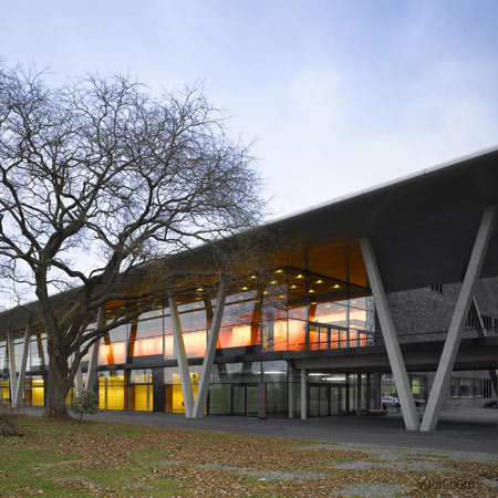 Offenburg会议中心由Freiburg建筑师事务所的Hetzel & Ortholf设计。该项目的名称是Stadthalle Offenburg,该项目把一个1960年前后的仓库改为礼堂,并加上玻璃前厅。玻璃盒子门厅的屋顶采用倾斜的柱子。