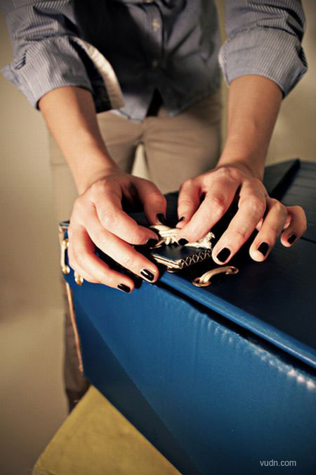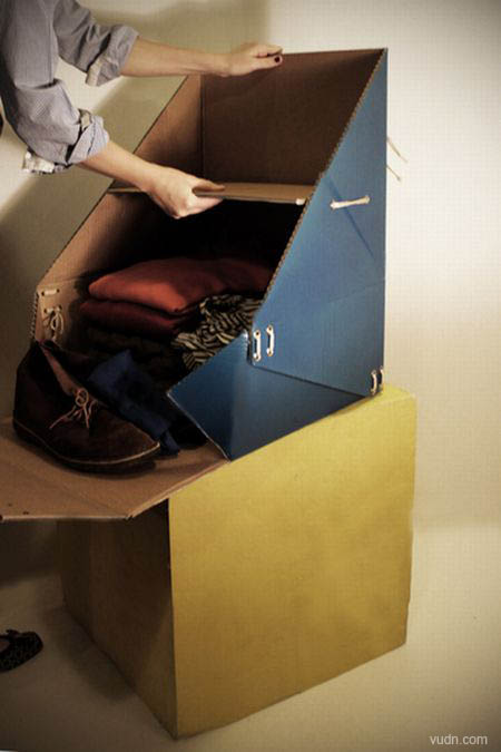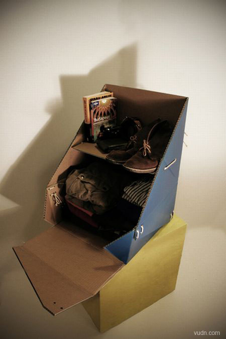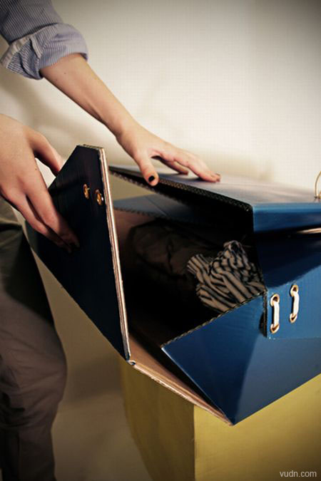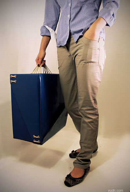 这是一款由设计师Chiara Goose设计的旅行箱,外表光滑,颜色深蓝,手感舒适。不仅可以用作旅行箱,在不用时也可以折叠成书架、置物柜,方便环保。