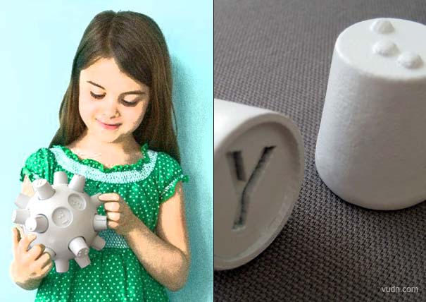 个挂钩,一个一个萝卜一个侧面,是现代的拉丁字母。另一方面就有相应盲文字符而且都有一个匹配的球孔。只要每次把匹配相应的洞,放上字符,对了说明就是匹配的,学习也可以是游戏。