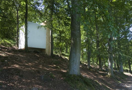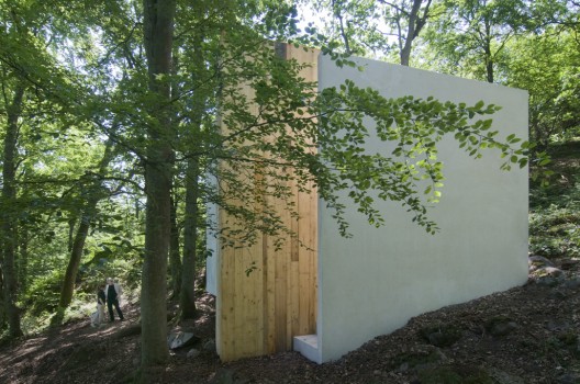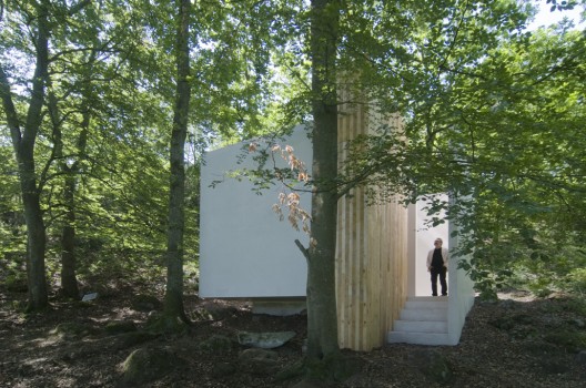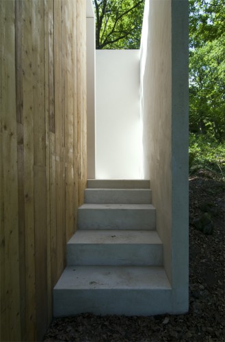 在木头与混凝土之间,一条通道打开室内空间。随着楼梯慢慢延伸,整个结构也渐渐收缩,并与地面贴紧。通道引向室内空间,来到一个木质内核区,一个凹进去的部分。天花板露出一丝天空,光线,雨丝,还有秋天的黄叶都偷偷溜进来,室内室外的界限就此变得模糊。