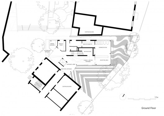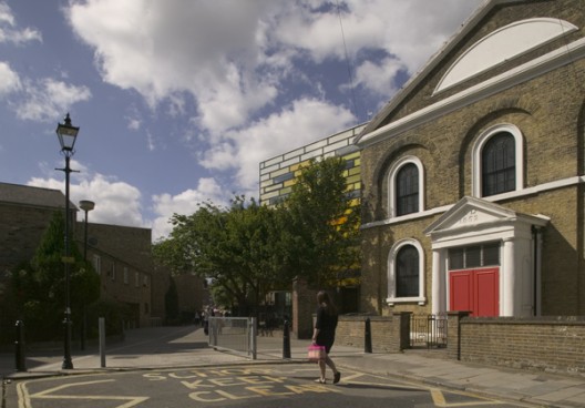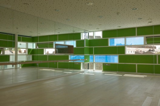 这个像珠宝一般的建筑是一个19世纪寄宿学校的附属建筑,用设计师的话说,就是在原建筑这个插座上插上了个新插头,从而使新旧能融为一体。人们首先注意到的必是一个多色的玻璃盒子,但这不是一个简单的玻璃盒子,立面上的板块从外面看都是一样光滑有光泽,从里面看则是不断变化的,可以是透明的,可以是半透明的,可以是不透明的。这个玻璃立面一方面可以增加建筑的能量吸收,另一方面还能充当教师的粘贴黑板。