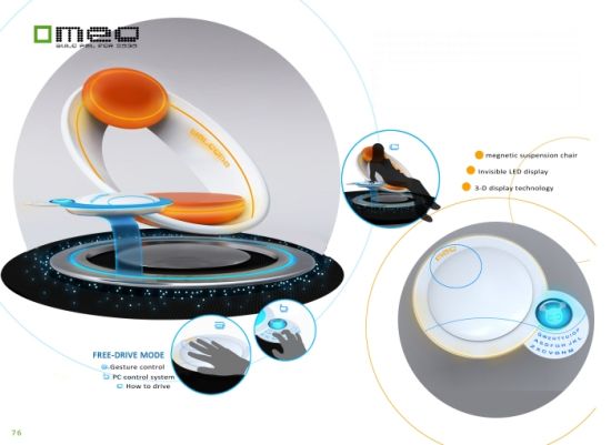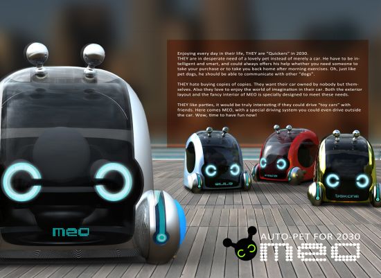 设计师Bolun Yang针对未来汽车的发展趋势,设计出了一款2030年的的个人交通概念车—“Meo pet”。这款新型的汽车整体体积娇小,但其内却配备了先进的磁悬浮椅子、无形的LED显示和三维显示技术。其紧凑的结构和先进的性能使其可像宠物一样陪着主人进行各种不同性质的户外活动,备受人们的欢迎。