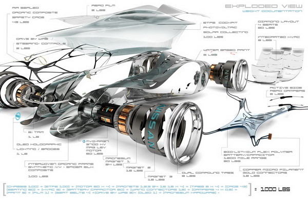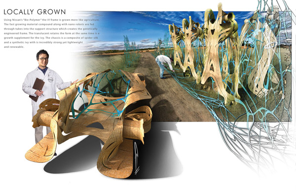 在2010LA设计挑战赛中,Nissan的一款IV系列概念跑车以电能传动系统和超轻量级的设计脱颖而出,它是一款高性能的电动跑车,灵感来自于大自然的美。该款跑车的外壳是未来2035年叶子外壳的一种演变。每一个细节都是设计对可再生能源,轻量级的能源的最大效率的利用。