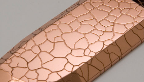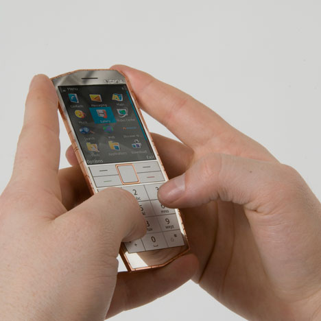 这款概念机名为诺基亚E-Cu,意为环保低碳,它内置热偶发电器,能将可获取的热能转换为电能为手机充电,其机身采用特殊材料的铜制成,并且雕刻有花纹,就像干涸的大地,代表大自然中的热量。你可以把它放在任何热源上充电,比如说散热器边,或是口袋里。