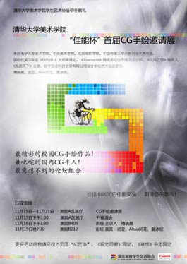 本次展览由清华大学美术学院学生艺术协会主办,将展出来自清华大学美术学院、中央美术学院、北京电影学院、中央传媒大学等高校的数百张优秀CG作品。展览无主题限制,由现场观众投票选出前两名。