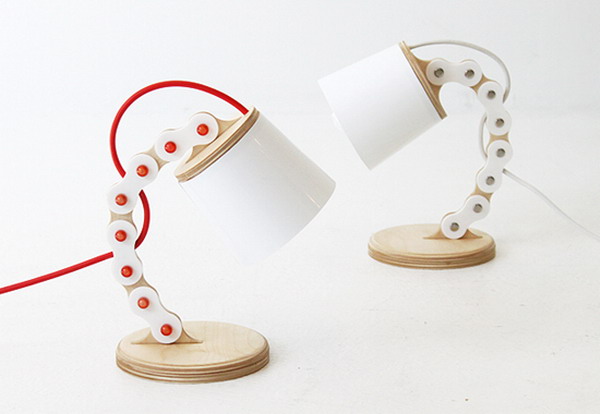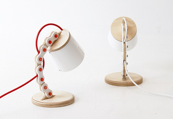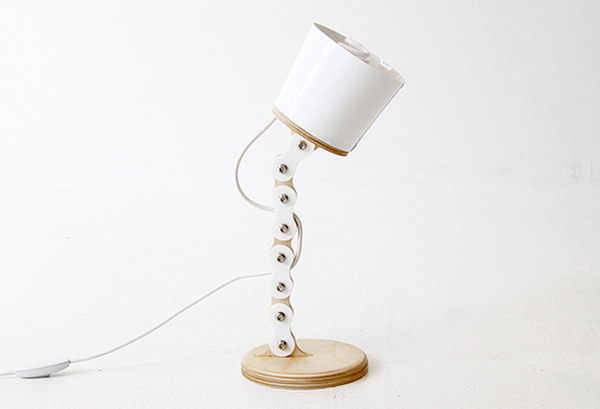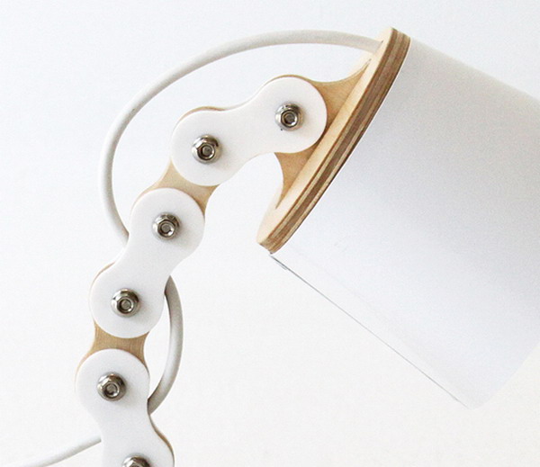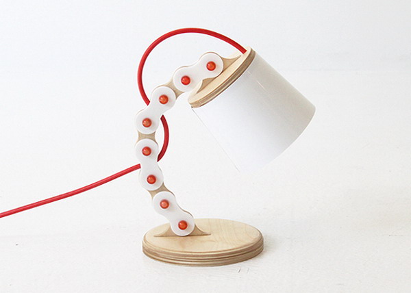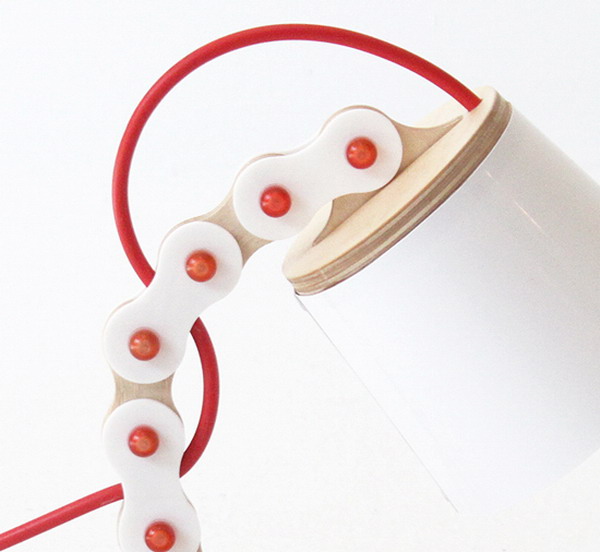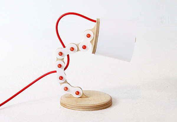 这是一款由设计师cho hyung suk设计创意台灯。以自行车链条为创意,使用户可以根据自己的喜好调整灯光的位置。该款创意台灯含有四个节点,可以在每个节点处调整角度,甚至可以自行添加节点,这样便可以使台灯达到任何位置的变形,使灯光更合理。