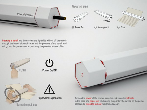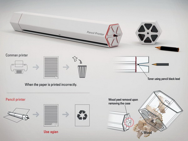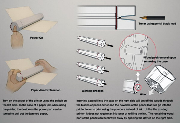 设计师Hoyoung Lee近日设计了一款环保的铅笔打印机,只要将废弃的铅笔头插入打印机上方的小孔内,打印机会自动把铅笔头削成粉末,然后运用电烧原理将木屑和铅芯粉末分开,并将铅芯粉末存入其墨盒内,这样就可以利用粉末打印了。不需要多介绍,大家看看草图就明白了。这款铅笔打印机摒弃了传统的墨盒的设计,利用铅笔芯进行打印,这样的打印文本还能够被被擦除,只需要将打印有文字的纸插进去,就可以擦出上面的文字,这样纸张还可以重复使用。