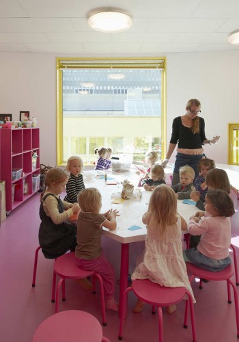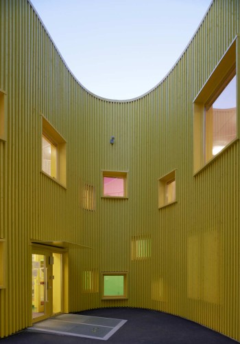这个幼儿园的场地是融合了不同的城市背景和规模。一个半遮蔽的入口院落组成了第一个室外的供孩子们和家长聚集的空间。有机的布局鼓励人流之间的互动,室内和室外空间都非常的具有延续性和流畅感。窗户自由地安置在墙面的不同高度,使光线和景色能透进来,被孩子们吸收,室内室外因此联系加强。