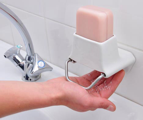 这是一个让人叫绝的点子,来自设计师Nathalie Stampfli的创意:擦丝肥皂架 (Soap Flakes),在肥皂架的下面增加了一个类似厨房中会用到的擦丝器结构,于是,每次洗手的时候,用擦丝器一拉一送,手里可就多了好多肥皂小颗粒,用来洗手刚刚好——虽然仍然是用的普通肥皂,但是再不会出现传统使用上那种每个人都得把肥皂在手里抚摸一番的不卫生。