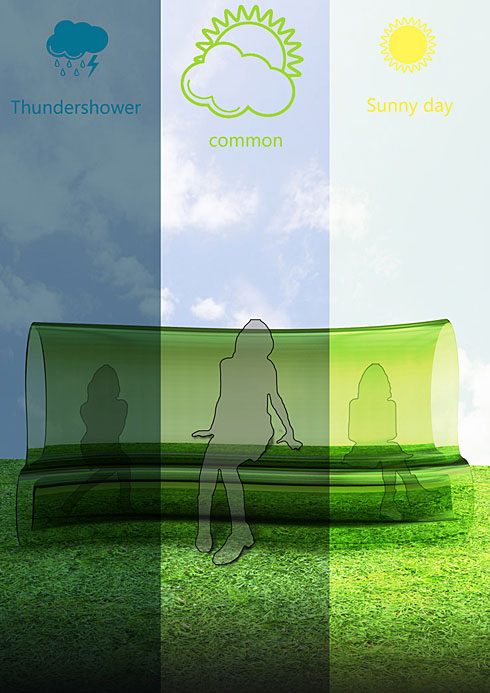 每把ShelterBench公共座椅都能提供两排坐位,而前排的椅背自然地延伸向后,与后排连接,形成一个管道状的遮阳棚——于是,天气好可以坐前排,或者坐后排说悄悄话,半透明的材质,让后排看上去就像是咖啡间的雅座,可以搂着慢慢地互诉衷肠;而天气不好的时候,那就直接去后排吧,透过天幕,还可以欣赏到朦胧的雨景,也不错。