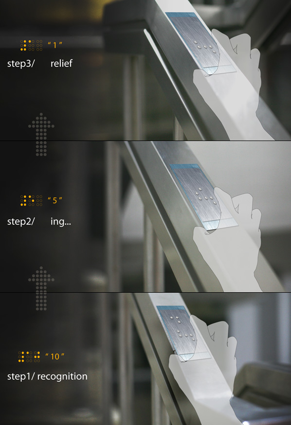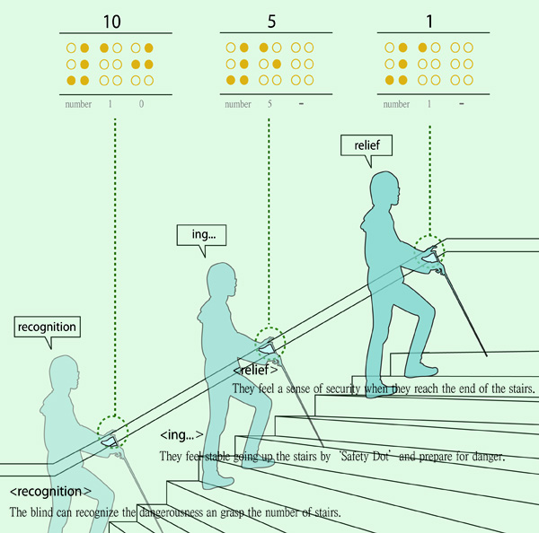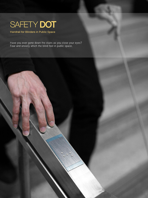 夜晚或者灯光昏暗时,正常人都需要小心翼翼地上下楼梯,以防意外发生。而对于盲人来说,上下楼梯对他们来说更加“危险”。这款楼梯特意在扶手上安装了金属铭牌,上面印有盲文导引,标明上楼梯的位置和重要信息,如:开始上楼梯、处在楼梯中间、再踏一步就到平台等,引导盲人更加安全地上下楼梯,十分人性化。