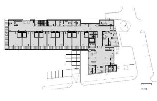 Hodoš老年中心位于Hodoš镇子的中心,连同学校,政府大楼一起形成社区活动系统,除了普通的为老人准备的房间,它还包括为其他人准备的公共空间。设计呈现出清晰的L形体量,首层是红砖色,与周围红色的屋顶相得益彰,营造出现代的气氛。