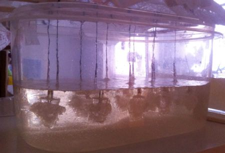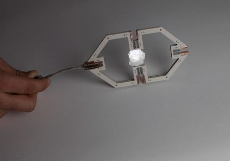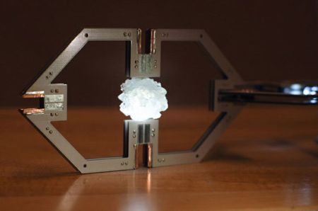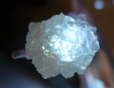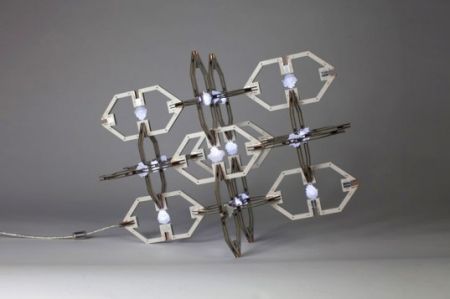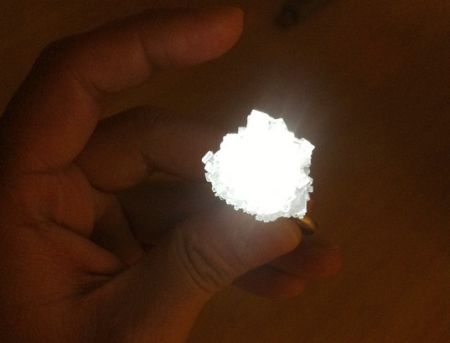 这盏灯的发光原器件为普通的LED,设计者将发光二极管(LED)放入浓糖水中,通过光的衍射将糖分子慢慢聚集在LED周围,经过10多天的时间最终形成了糖结晶。特别的糖结晶灯外形天然无雕饰,灯光柔和,模块化的单体设计还让使用者可以自由安排灯的外观与布局。