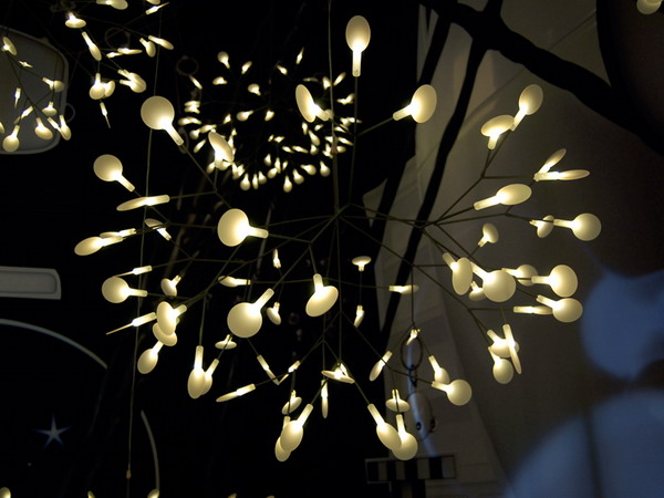 设计师用一种金属线框制作了灯具的大形态,装饰在“枝杈”上的塑料镜片作为叶子,被63个LED 灯照亮。这些发光的叶子可以自由旋转并根据需要移动位置。