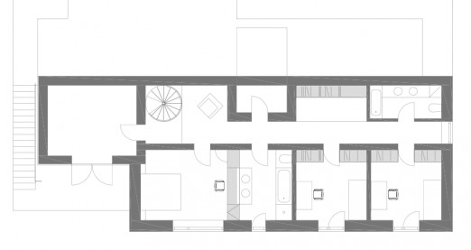 住宅设计的灵感来源于传统的乡土建筑,但是在此基础上去掉可居住的阁楼空间,也不在阁楼外面设置窗户。起居空间在卧室区之上,占据了整个阁楼空间,设计没有采用任何临时装设板,而是全部依靠钢铁梁柱。同时,室外的斜坡将住宅分为两个部分:坚实的石头底座上面漂浮着轻质的木质结构,尖尖的屋顶呈45度的倾斜角。