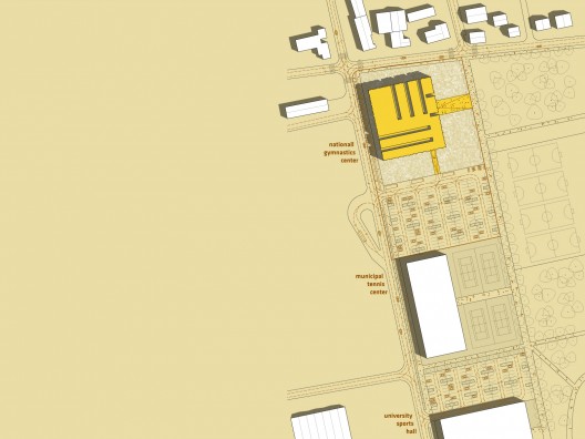 这个国家体操中心主要是为运动员提供每日的训练场所,它是运动员经常待的地方。设计的中心指导思想是使尽可能多的自然光进入室内,同时使使用者和体育有直接的联系。功能设计的主要元素是一个中心的公共空间,它将所有的项目元素连在一起,从而使人们有向着训练场所的开阔视野。不仅主要的公共场所为人们提供全方位的体育感觉,办公空间,体育酒店公共空间,商店,餐厅和其他空间到处都能让你感受到体育的氛围。中心公共区的分支形状和别样色彩是室内主要的特色,它实际上是从室外一直延伸进来,因为入口平台也是这个整体的组成部分。同样公共区还延伸至看台,看台不仅是看台,还增加了训练场的面积。
