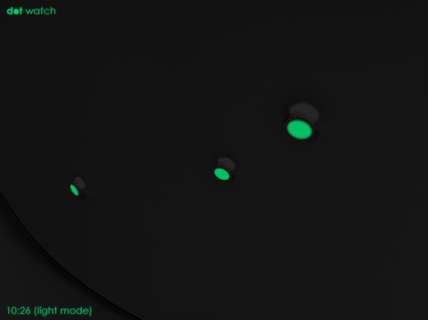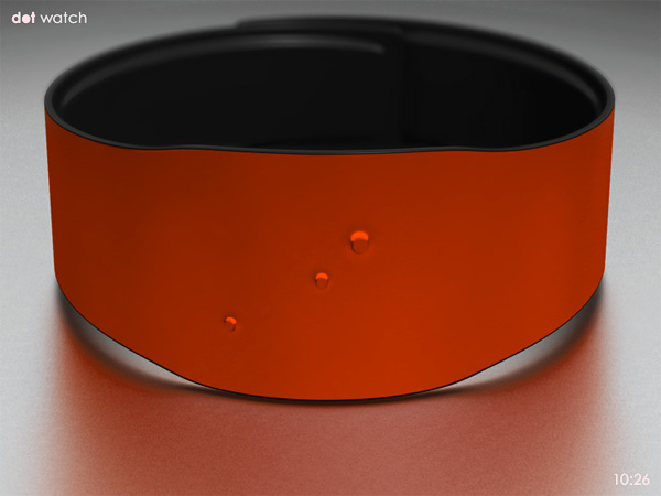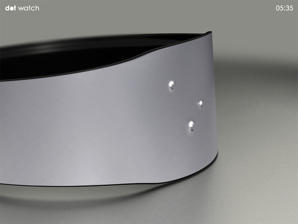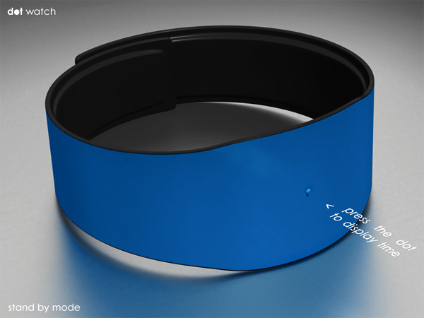 这是由Samuel Jerichow设计的Dot 手表,它由单个可伸缩的有弹性的PVC板构成。中心处有个小圆点,按压一次后它的周围会奇迹般得出现另外两个小圆点,离的近的代表小时,远的代表分钟,5秒后它们消失。按压两次开启夜光,方便晚上读取时间。