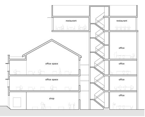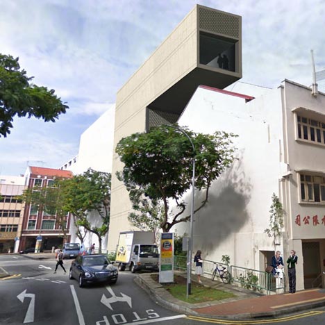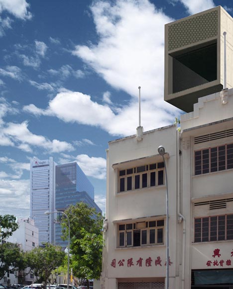 这是由伦敦工作室设计的一个位于新加坡的办公楼,它有着独特的造型,如同一个巨大的潜望镜。建筑蜷缩在一个十九世纪的店屋后面,它呈现出一个巨大的悬臂结构,漂浮于已有的楼顶结构之上。悬臂包含一个顶层的餐厅,下面是四层的办公室,建筑由加固混凝土建成,前后表皮包含穿孔的铝制板面。一个两米宽的空隙将店屋与扩建部分分开,这个店屋也会被改造并为一二层提供办公空间。项目目前还在等待当地规划部门的审核和认可。