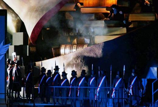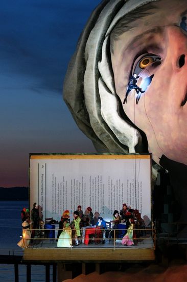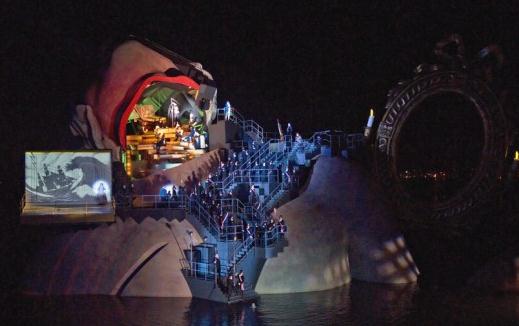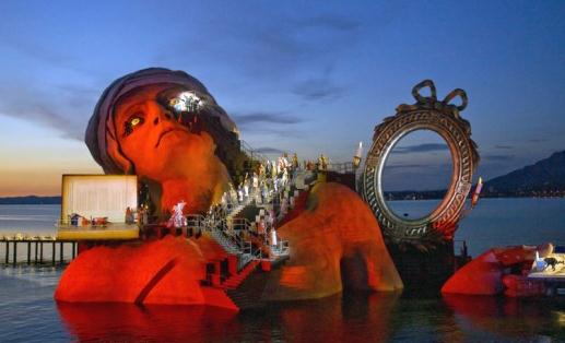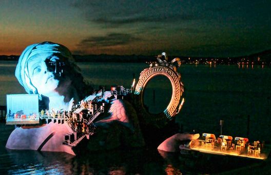 《安德烈·谢尼耶》是意大利作曲家Umberto Giordano最著名的歌剧,近日这个歌剧被搬上2011年布雷根茨歌剧节的漂浮舞台上,呈现出令人震惊的布景和造型。生动的历史情节和极具悲剧色彩的故事被放置在完全防水的直接建于湖面上的舞台布景之中,最下面是一个混凝土核心底座,木质的支柱支撑着舞台的其他附属结构。