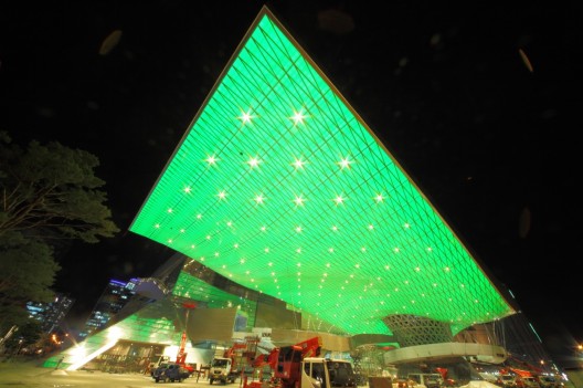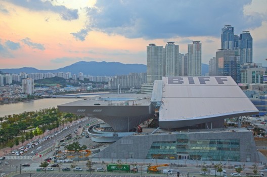 这个位于韩国釜山的电影院由着名的蓝天组事务所设计,它将是釜山电影节的新家,这个创新的建筑结合开阔空间,文化项目,娱乐,技术与建筑于一体,以一种崭新的方式呈现,开幕当天电影院迎接了多达八百名的观众,这其中包括釜山市长,文化部长,体育部长和电影明星等。项目开始于2005年的公开设计比赛,建造也在同年展开,屋顶天花板表皮用LED灯点缀,从而制造独特的视觉效果,突出釜山影院的地位和角色。动感的天花板将充当影院的交流平台,游客和路人将在其下享受开阔的空间。一个自由的85米宽跨度和60乘以120米的屋顶面积使这个屋顶成为世界上最大的悬挑屋顶。