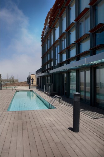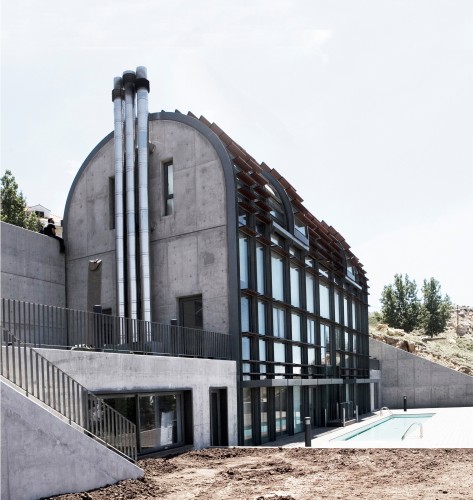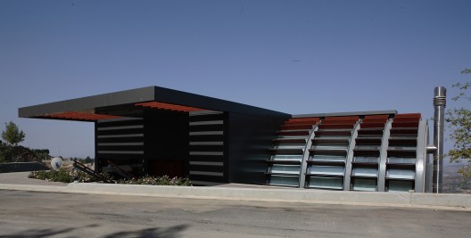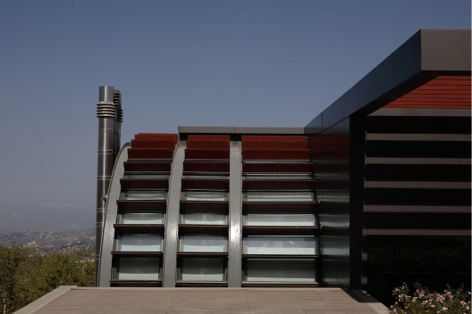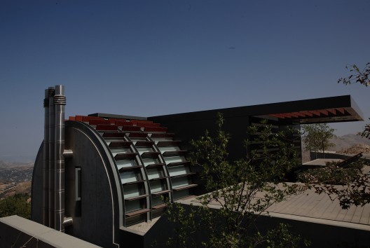 这个住宅位于一个占地1000平方米的场地上,场地的几何特性定义了建筑的平面布置,呈现出一个矩形的体量,所有主要的功能都被集中在一个三层的住宅里,一个车辆的入口,加上停车和服务等空间位于住宅的地下层,这里与底层的道路直接相连。上面是一个夹层,它包括两个客房和一个健身房,并且呈现出完全敞开的前立面,住户可以直接进入阳光露台和泳池。从场地上侧南部的入口看去,前面的表皮呈现出圆柱形的形状,它从地面往上,整体环绕建筑。