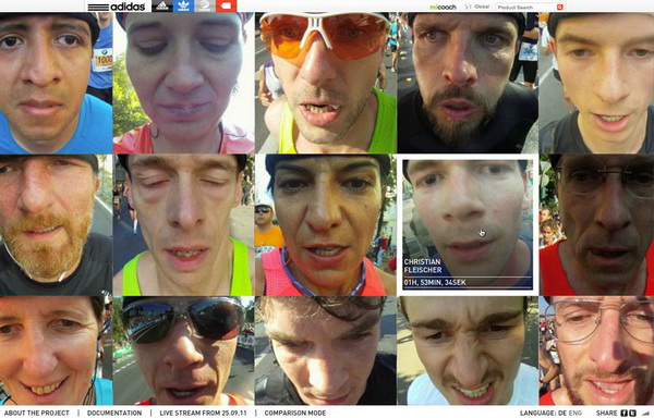 在柏林马拉松比赛中,15名选手被安装上了特制的照相装置,实时记录了全长 42.195公里的比赛实况。在活动页面上,观众还能查阅到选手的个人资料、对其的采访,以及在比赛中的跑步时速。