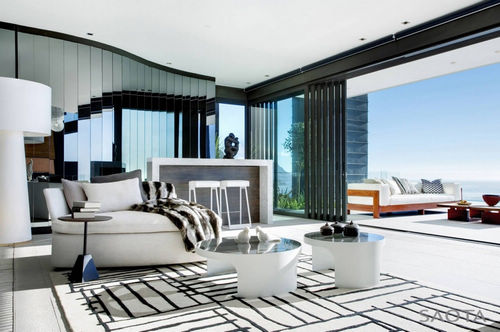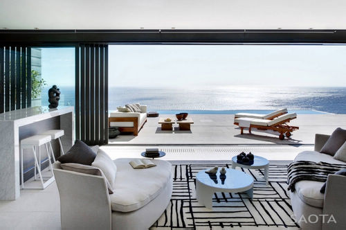 该项目是由SAOTA设计的Nettleton 199别墅,坐落在山坡脚下,最大限度地实现了与室外大西洋海景的联系,还将东边的花园联系起来,并且最大限度地减少了相邻建筑物之间的影响。住宅是一个双体量的建筑空间,呈L形,这样可以连接起东部的花园和西部的海景。这个建筑提供了一个戏剧性的体量空间和充满活力的内部空间。入口大厅是一个垂直空间,这里对应着住宅的生活空间。通过楼层地板将这个大体量的区域分隔成两层。卧室一层像是从屋顶垂挂下来一样悬浮在空中。这个设计元素,提供了一个柔软的S形曲线,这里包含了主卧室以及附属空间,它们由一系列的核桃百叶窗将其于客厅分离开来。
