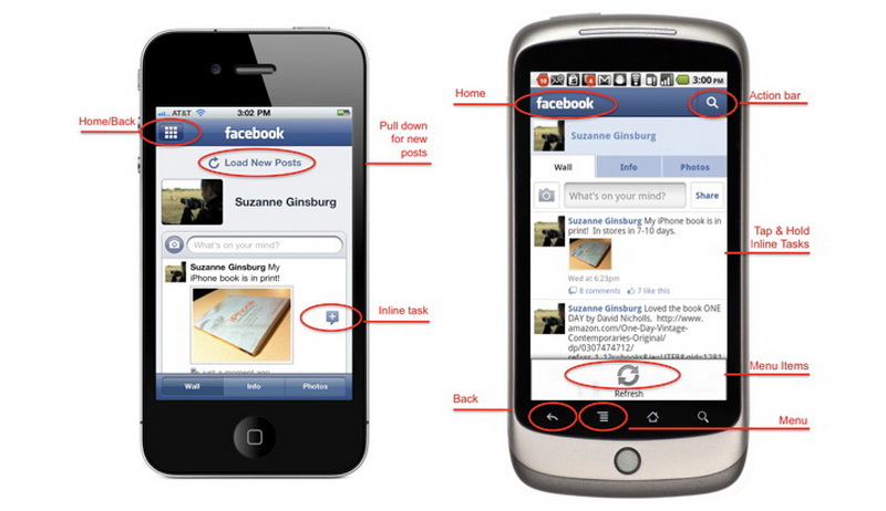 Facebook在iPhone和Android平台上的界面设计。有着相同的品牌元素,且符合各自平台的用户操作体验。详细看图中标红的部分。其中展示了在两个平台上,用户是如何返回主界面,如何刷新,如何发起信息的富操作任务的。显然,Facebook在设计不同平台上的app时,并没有简单粗暴的把iPhone上的体验照搬到Android上,而是进行了平台针对性设计。